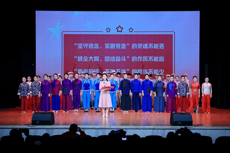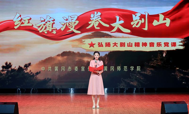《红旗漫卷大别山》音乐党课紧扣“坚守信念、紧跟党走,顾全大局、团结奋斗,勇当前锋、不胜不休”的大别山精神核心内涵表述,以新民主主义革命历程为脉络,通过9首红色歌谣串联“先驱播火,唤起工农跟党走”“不胜不休,苏区红军用战斗”“孤悬敌后,抗日劲旅歼倭寇”“勇当前锋,千里跃进利剑飕”四个篇章,通过“听红歌-学党史-悟思想-见行动”的内在逻辑,融合歌舞、情景剧等多元艺术形式再现大别山波澜壮阔的革命历史。